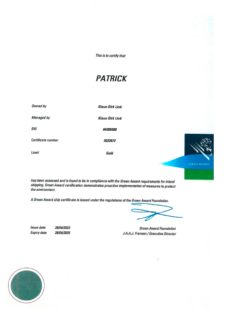 Nach der Neumotorisierung mit Abgasnachbehandlung hat unser Mitglied Klaus-Dirk Link mit seinem MS „Patrick“ im April 2022 von der Green Award Foundation den „Green Award in Gold“ erhalten.